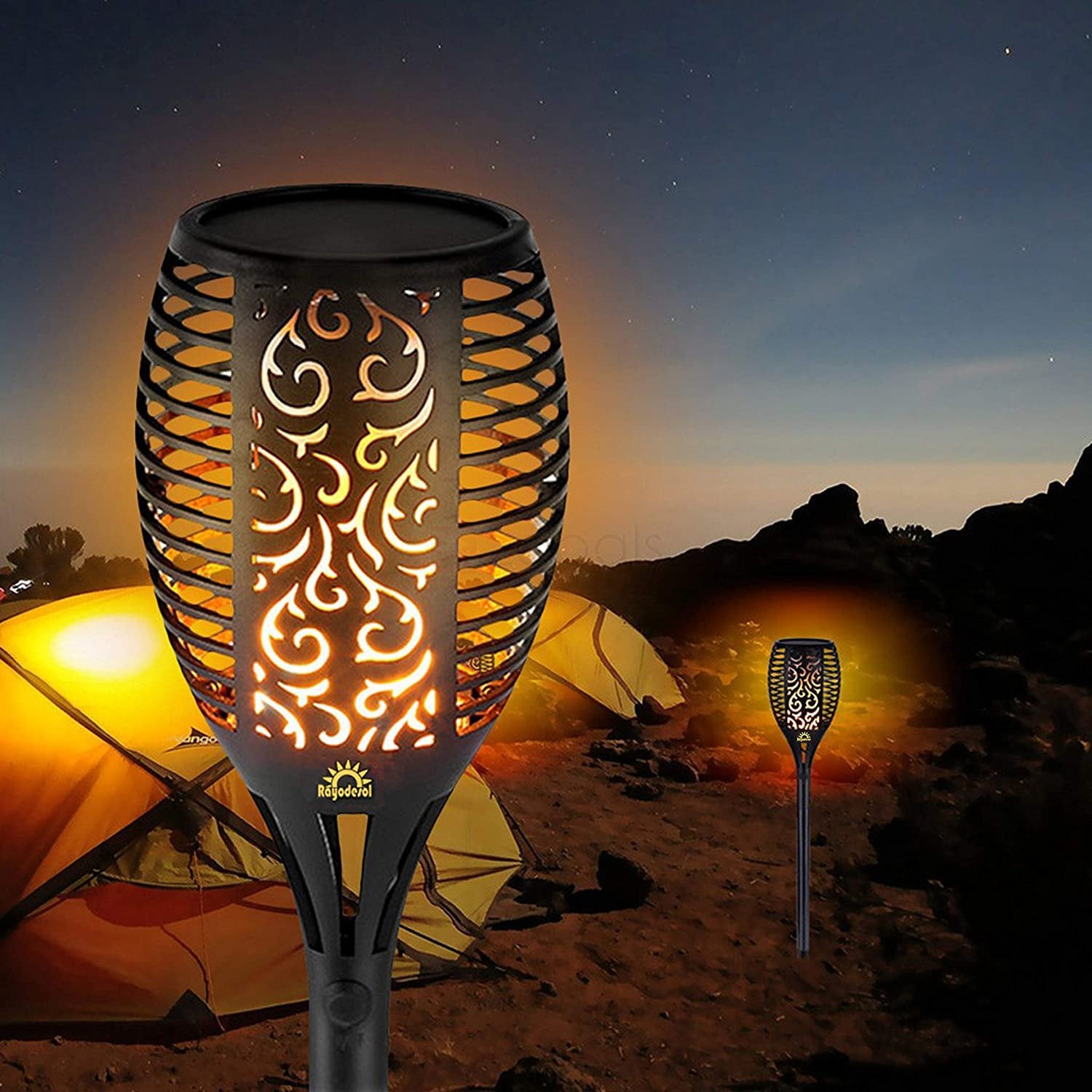 - A safe alternative to the real “flames” — 96pcs LEDs in the light cast a safe, soft, mood-enhancing glow.The actual height of the solar torches is 33.5 inches.(Accessories include) If it doesn't work for a while, because Battery capacity reduces over time, switch the light off for 3-5 sunny days in order to boost the batteries. Weather will affect these solar lights` working time