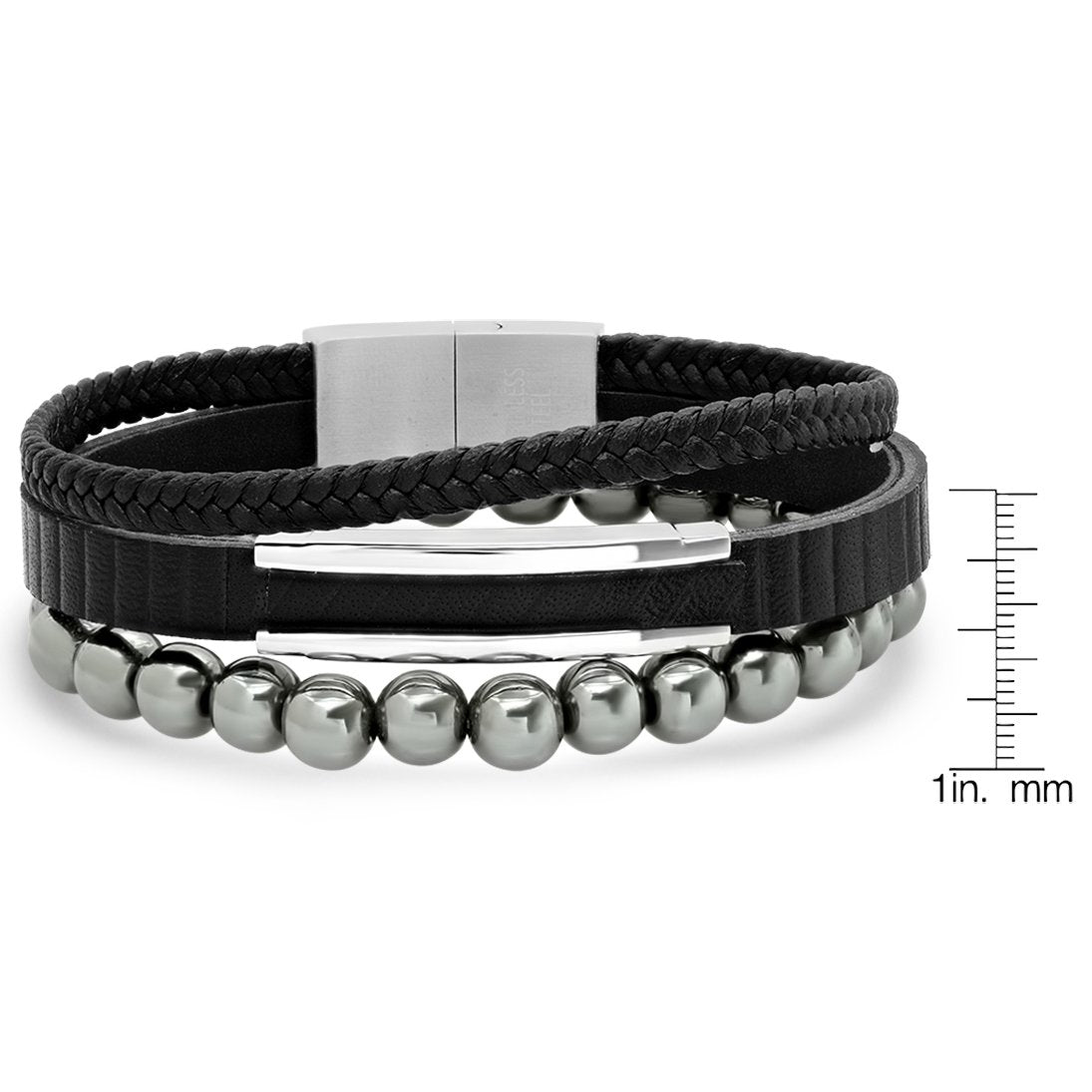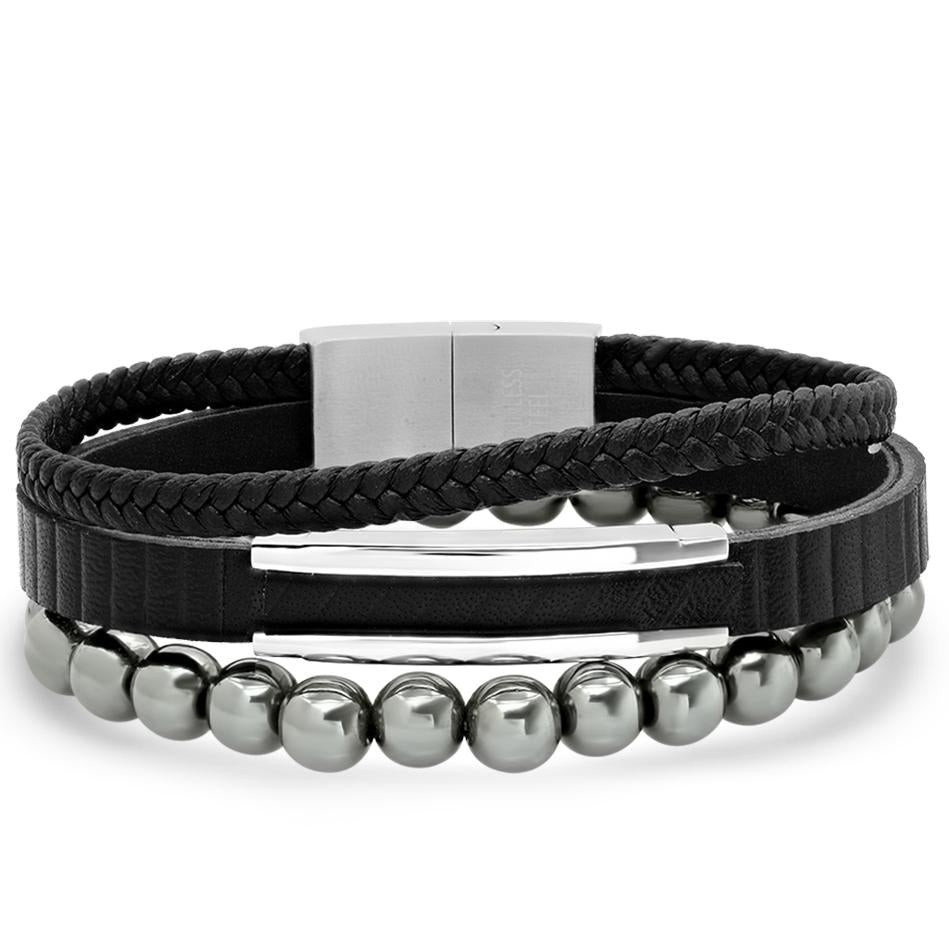 2-Piece Set: Men's Layered Black Leather, Stainless Steel and Hematite Beads Bracelet