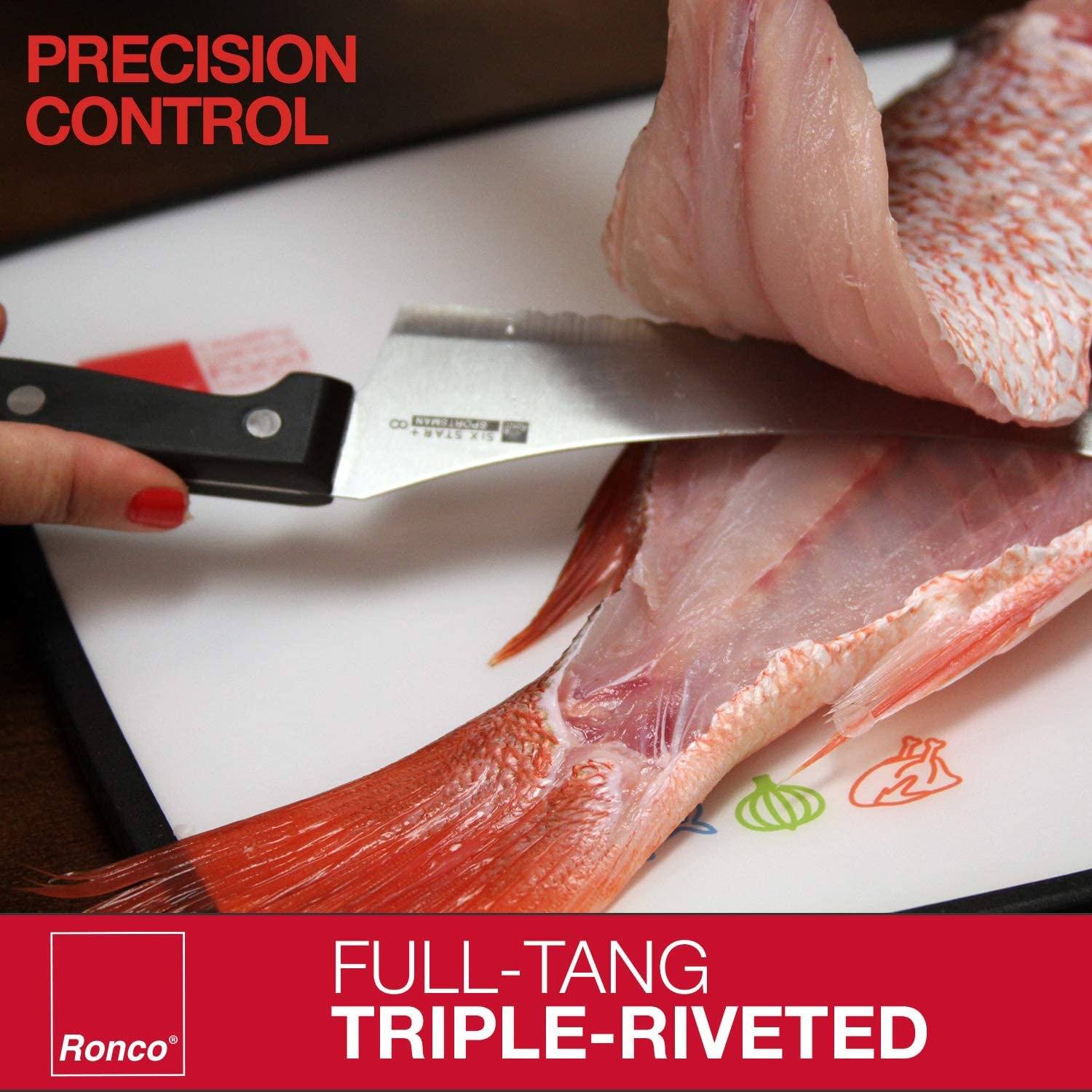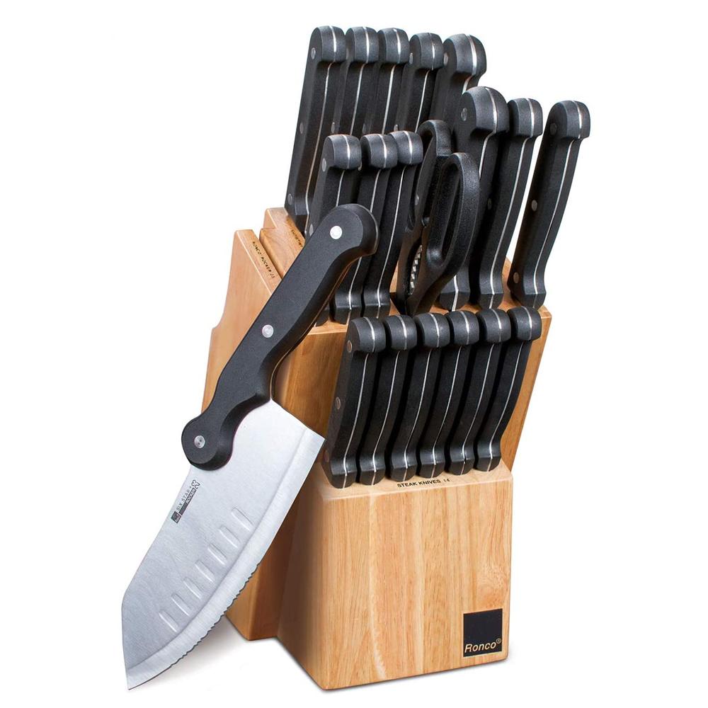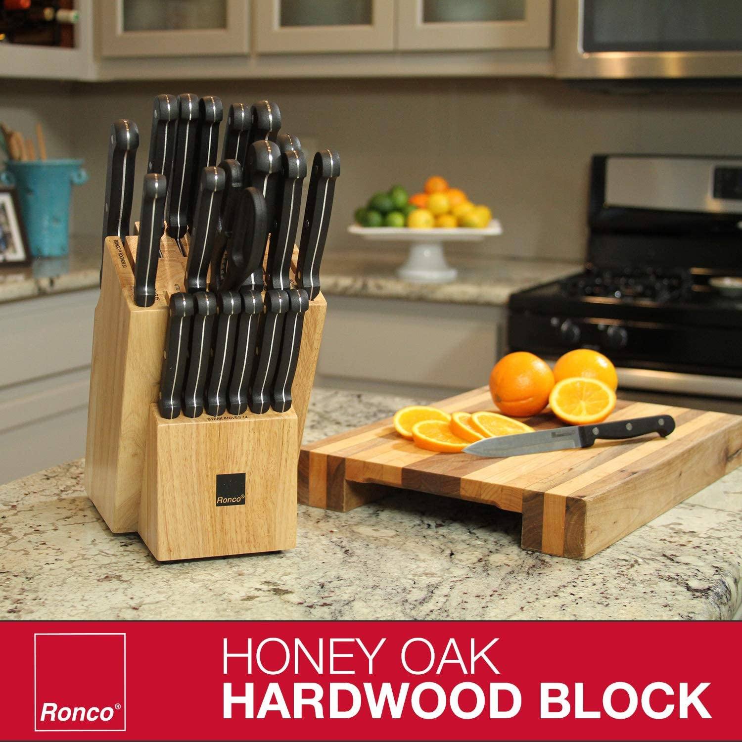 Ready to step up your game in the kitchen? With the Ronco 20-piece knife set you get everything you need to master dinner. Plus, it comes with a beautiful, hardwood knife block that works with any kitchen design. Ronco products are designed with safety in mind, so each knife fits perfectly into the knife block which features 4 non-skid feet to prevent sliding. Additionally, all knives have a full-tang handle and are triple riveted giving you full control and lasting durability. With this professional knife set, you’ll be ready for anything dinner throws at you.
