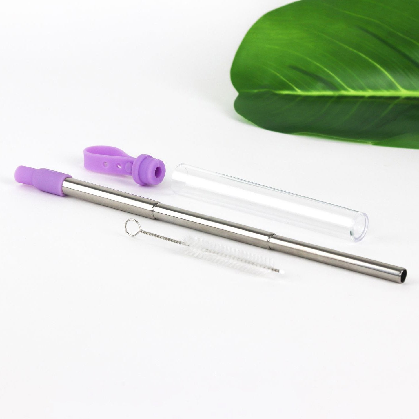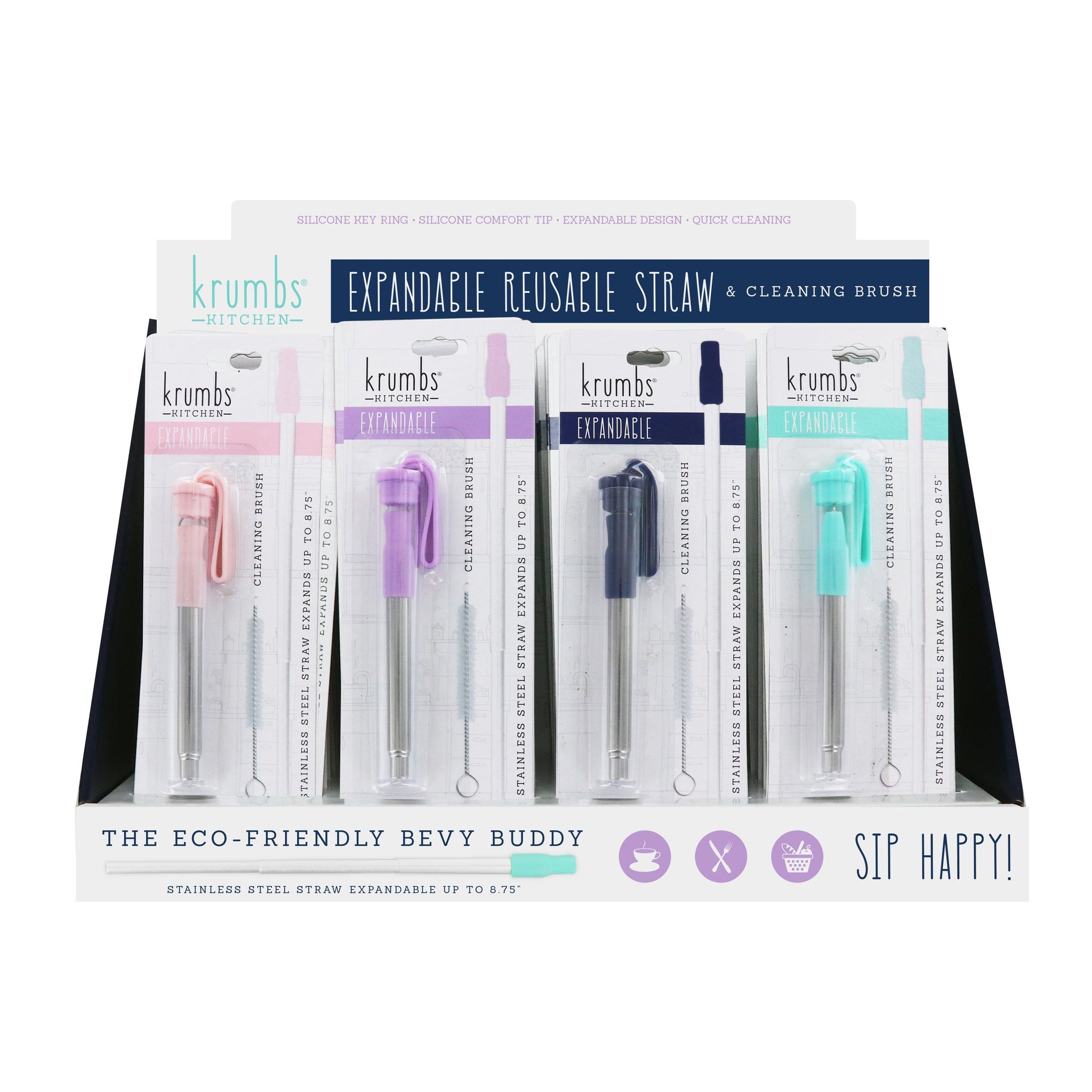 Sip happy with the eco-friendly bevy buddy! Our expandable, reusable stainless steel straw travels with you everywhere on a silicone key ring. Its nesting design opens like magic to fit any size cup or glass, and silicone comfort tip protects from both hot and cold drinks. Included chimney brush makes cleaning a breeze! The amazingly convenient alternative to single use plastic straws.