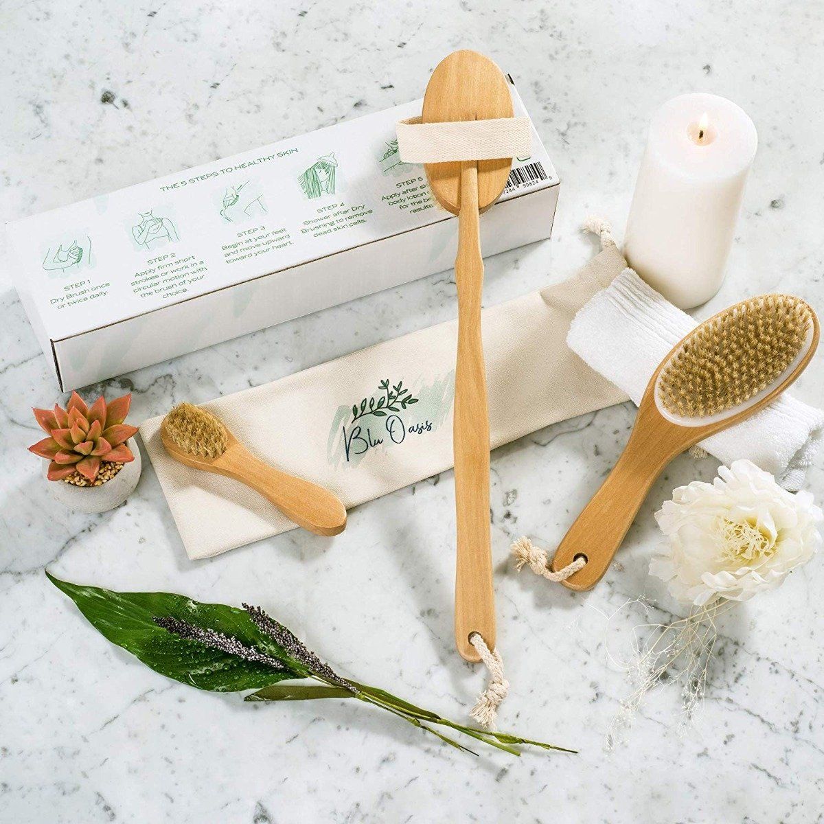 - Included in our premium 3-piece set; a long-handled dry body brush with removable head, a short-handled dry body brush, a small dry facial brush and a 100% cotton travel bag with drawstring closure