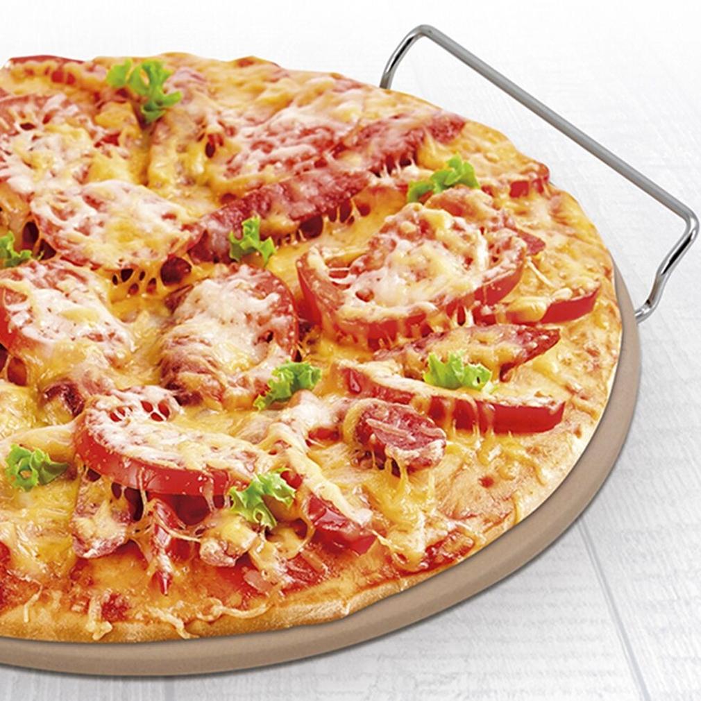 Ceramic pizza stone designed to absorb moisture for perfect, evenly-baked pizza dough's; comes with a cooling rack with handles.