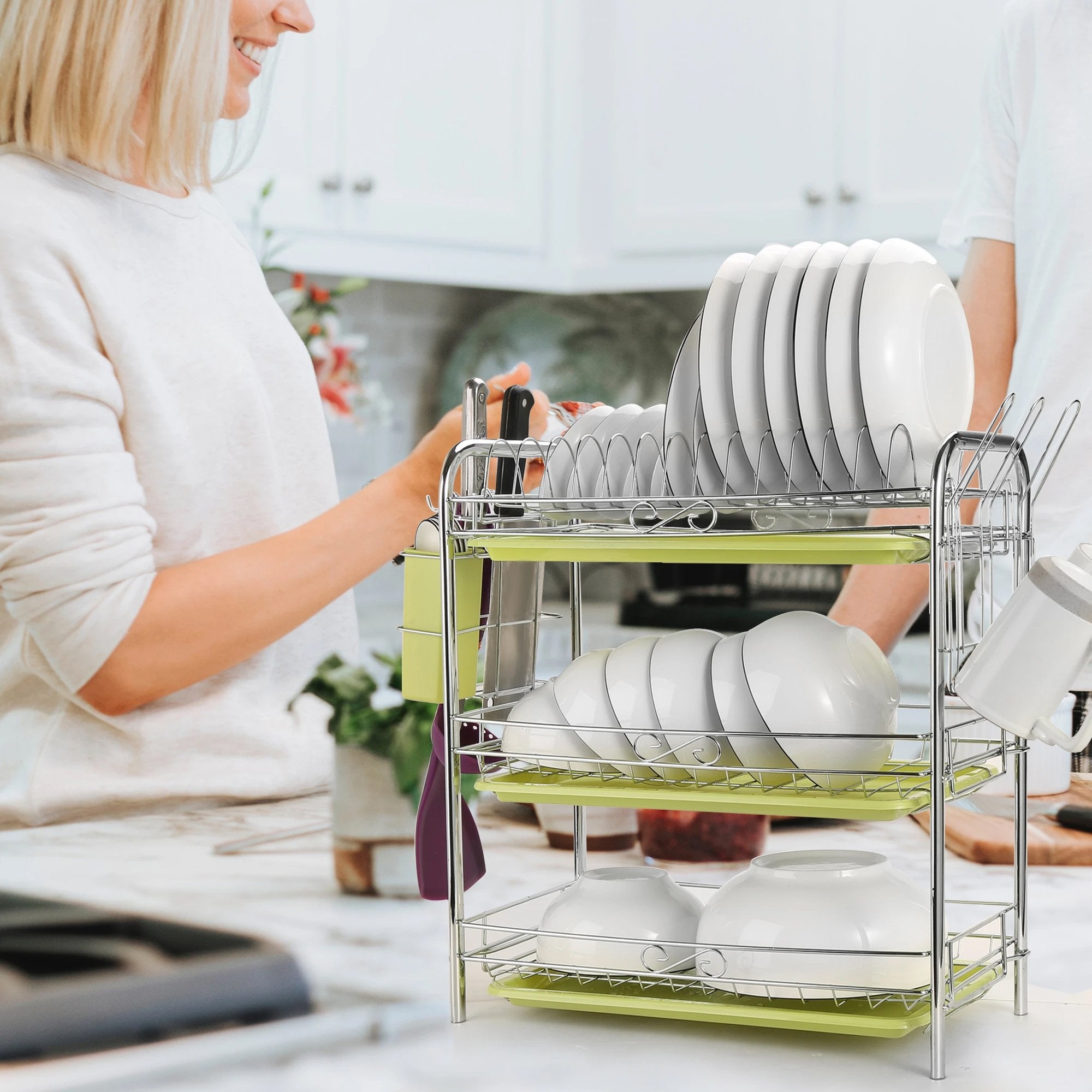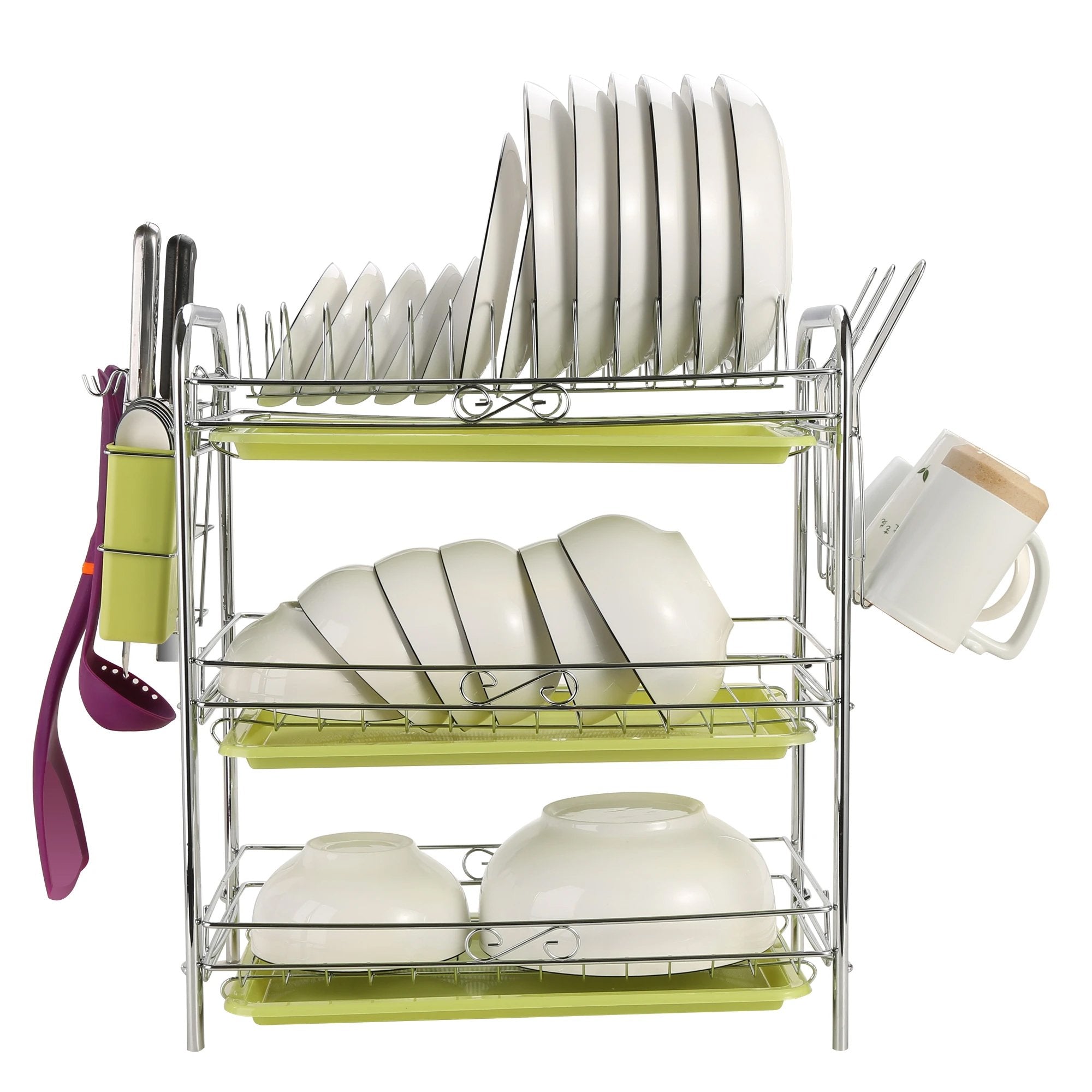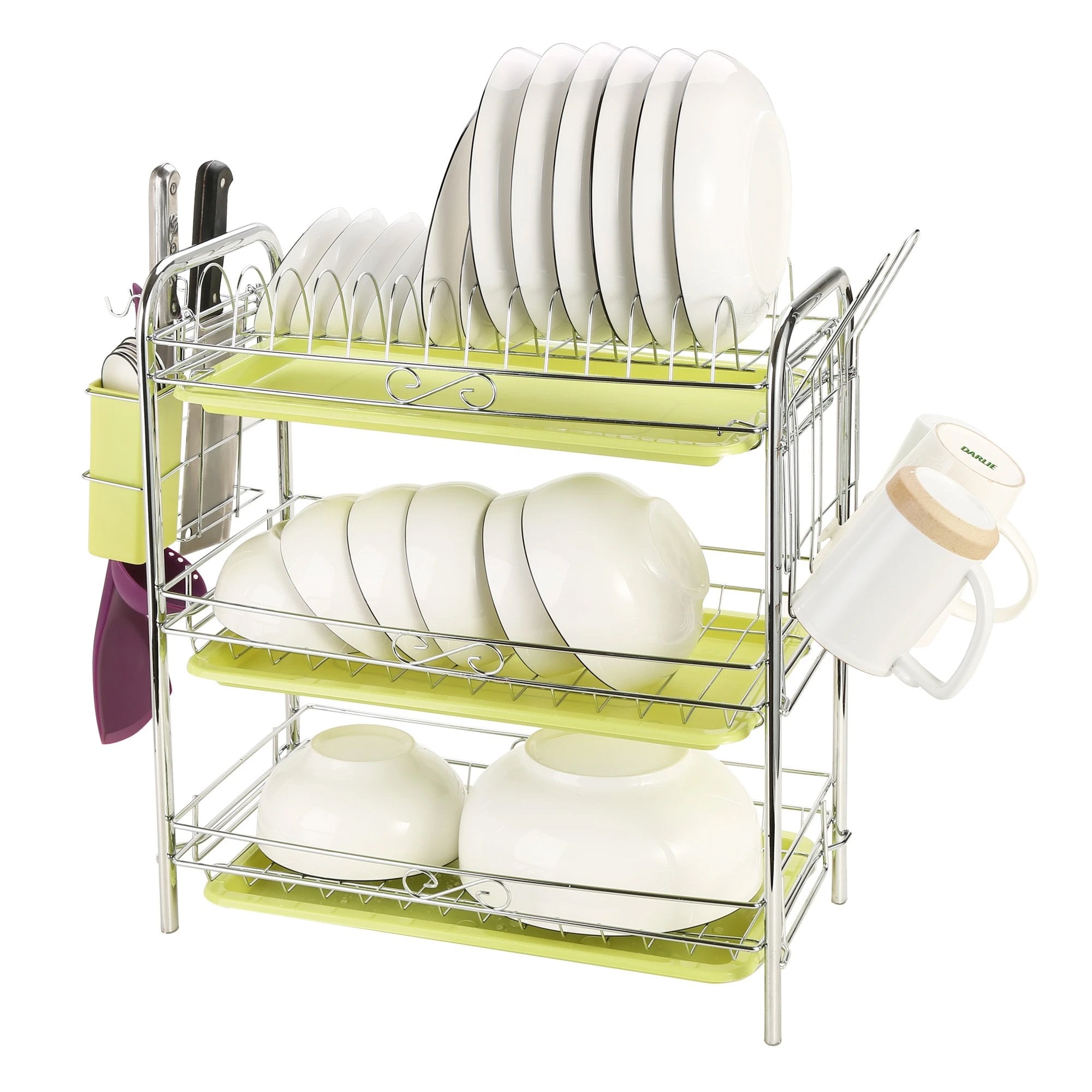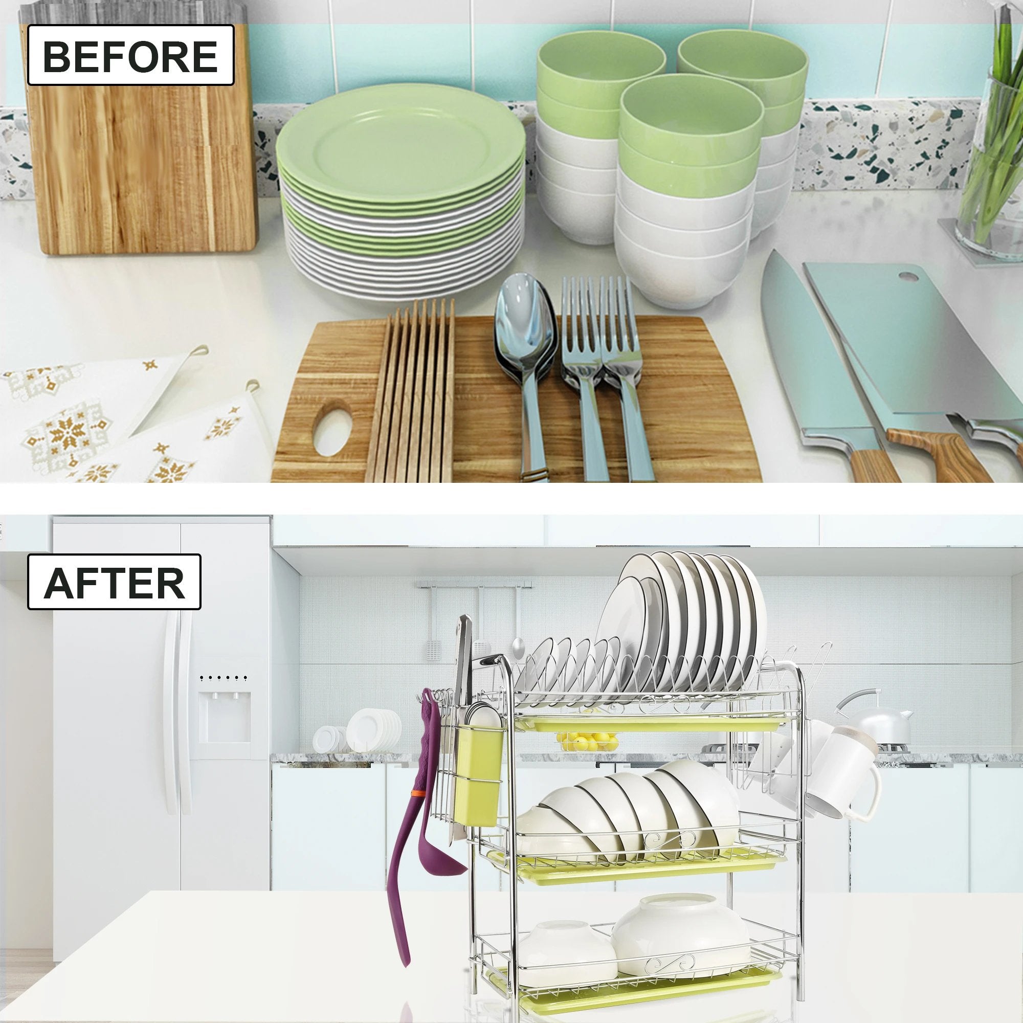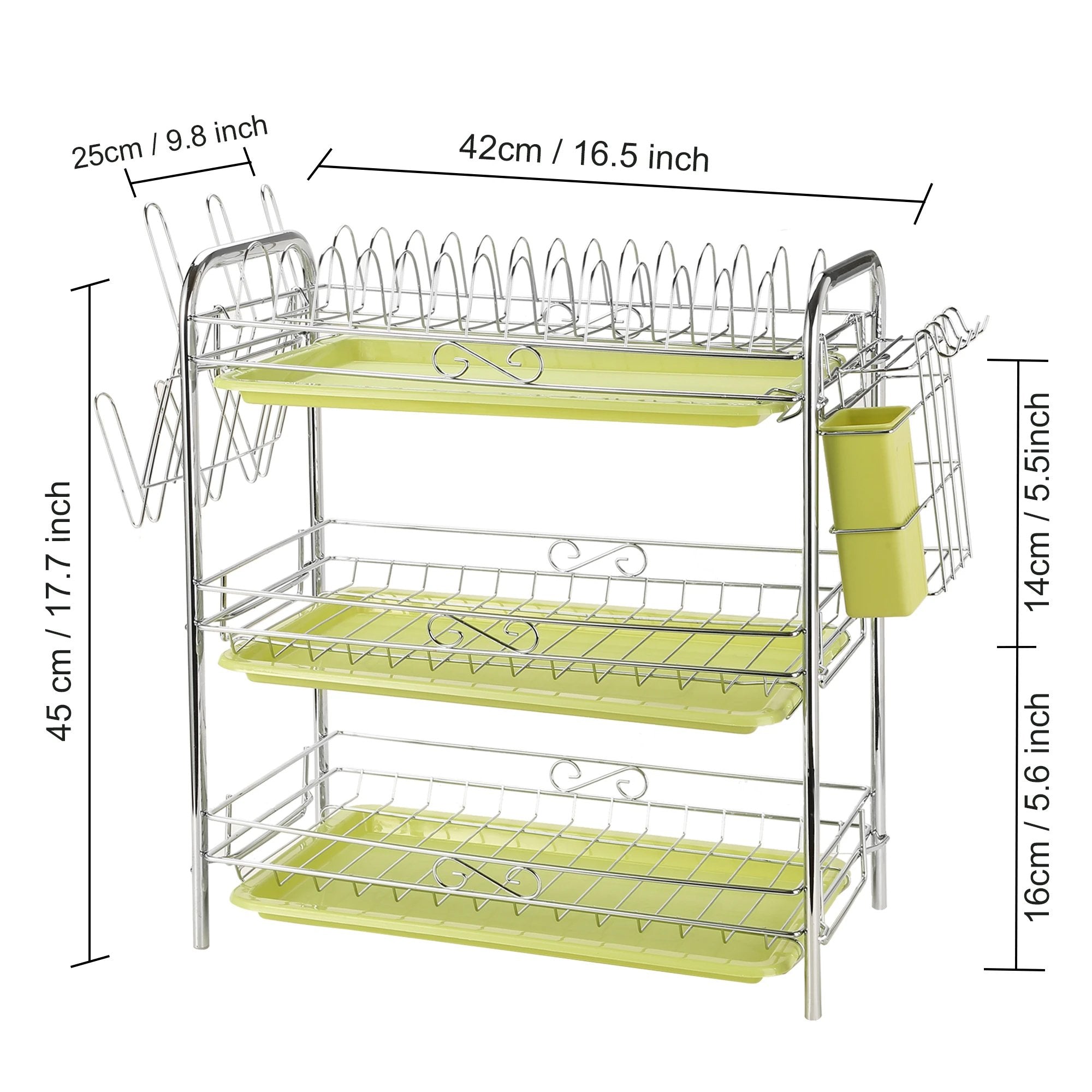 This dish rack are designed in 3 layers and can hold more bowls and plates. The hooks on the side can hold 6 cups multiple forks and chopsticks. Made of new chrome-plated rust-proof material for stability and durability. Each floor has a drawer-type water tray. The water tray has a food grade PP material, which is environmentally friendly and flexible.