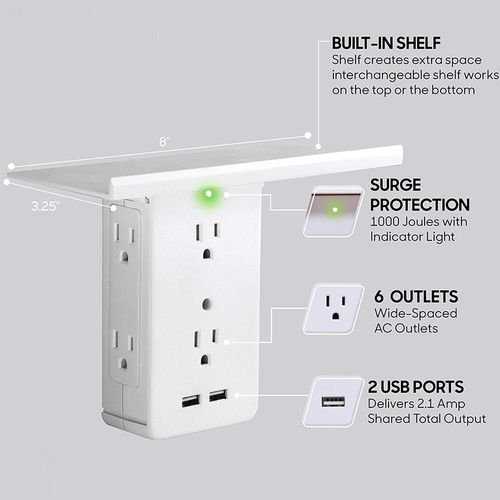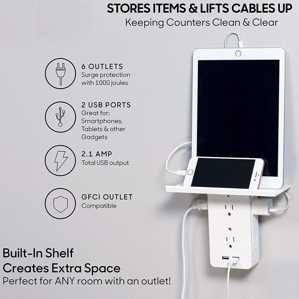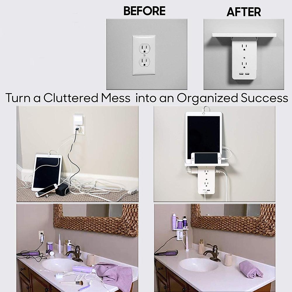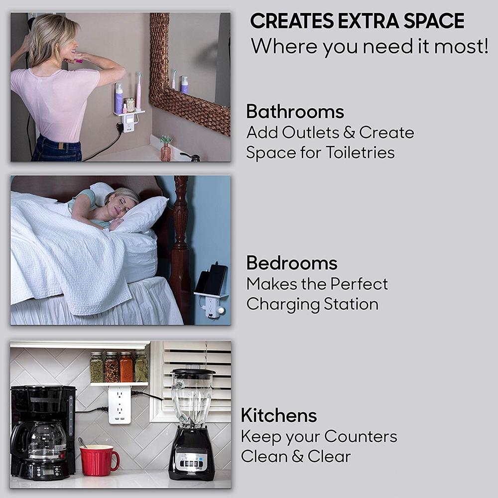 The incredible new wall outlet expander that adds a shelf to any outlet for clutter free counters. It features a built-in storage shelf keeping all your electronics safe, organized and fully charged. Perfect for following recipes in the kitchen, keeping your phone close and charging in the bedroom or the garage.