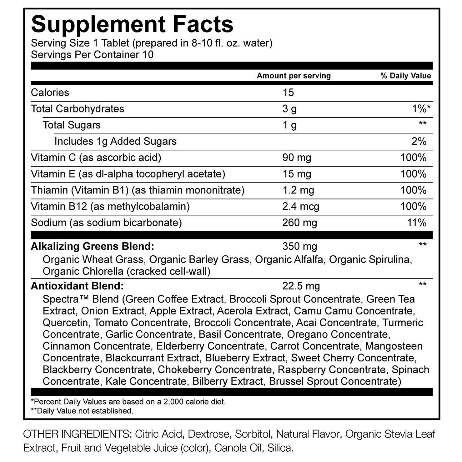 • Each tablet contains the antioxidant equivalent of one full serving of greens and veggies. Support immunity with 100% daily value vitamins C & E. Helps energize with alkalizing greens & 100% daily value of vitamins B-1 & B-12