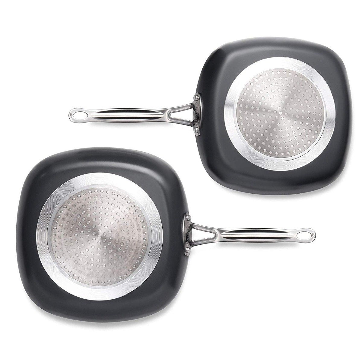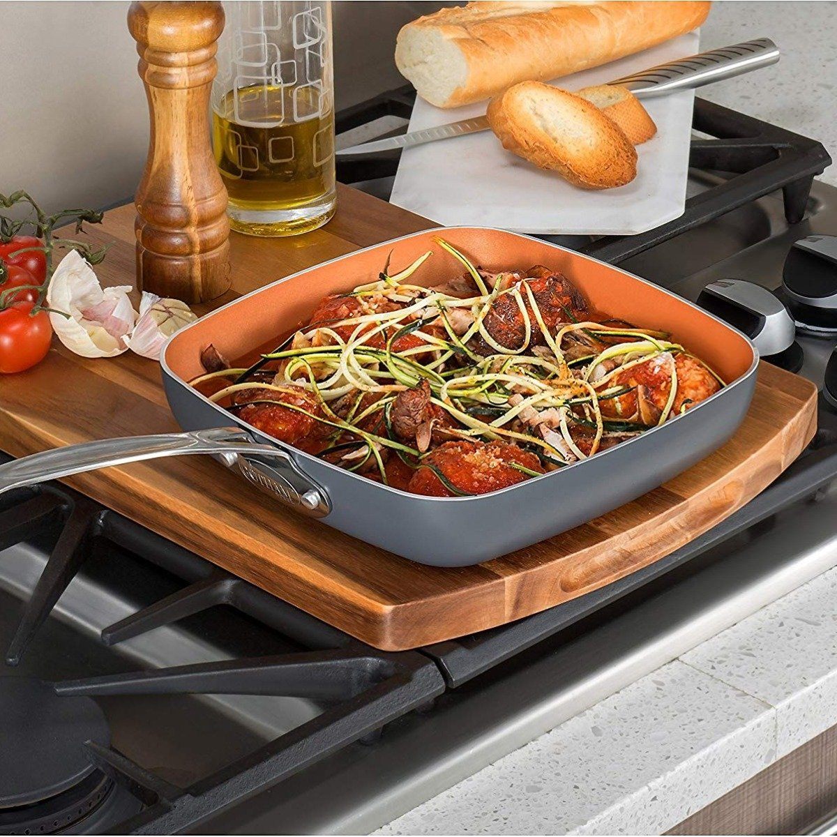 Gotham Steel non-stick copper cookware set includes 3 square shallow fry pans- 8", 10" and 12". we decided to make the traditional round pan more practical by taking it & changing its shape to a more squared design. Why square? because square fits more and takes up less room in your cabinet if you can only have one pan- the Gotham Steel shallow square pan should be the one! Gotham Steel titanium and ceramic square nonstick frying pan about the Product Gotham Steel is the first Product of its class to utilize high-grade titanium and ceramic as surface finishing. This sophisticated combination not only ensures maximal durability it also allows for multi-fictional, all-around usage. Titanium plus ceramic coating faqs high-heat threshold to sear perfectly browned steaks! everything just slides right off, even burnt chocolate and cheese. Food flavor is not altered when cooking tomato-based or any acidic food products thanks to the ceramic component! the non-stick surface cleans easy! versatile: for stove-top cooking, or baking! rust-proof all over. Coating doesn't peel off with constant usage and washing.
